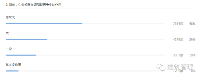 1)就目前而言,施工資質(zhì)的高低還是企業(yè)競爭力重要組成,在“建筑管理”微信公眾號(hào)2016年8月16000人參與的“資質(zhì)標(biāo)準(zhǔn)問題調(diào)研”中,資質(zhì)在項(xiàng)目競爭中作用“大”的占26%,認(rèn)為“非常大”占48%,合計(jì)74%。